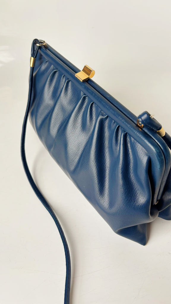 Vintage 1980's navy clutch. Snap top closure. Shoulder strap. One inside zipper pocket.