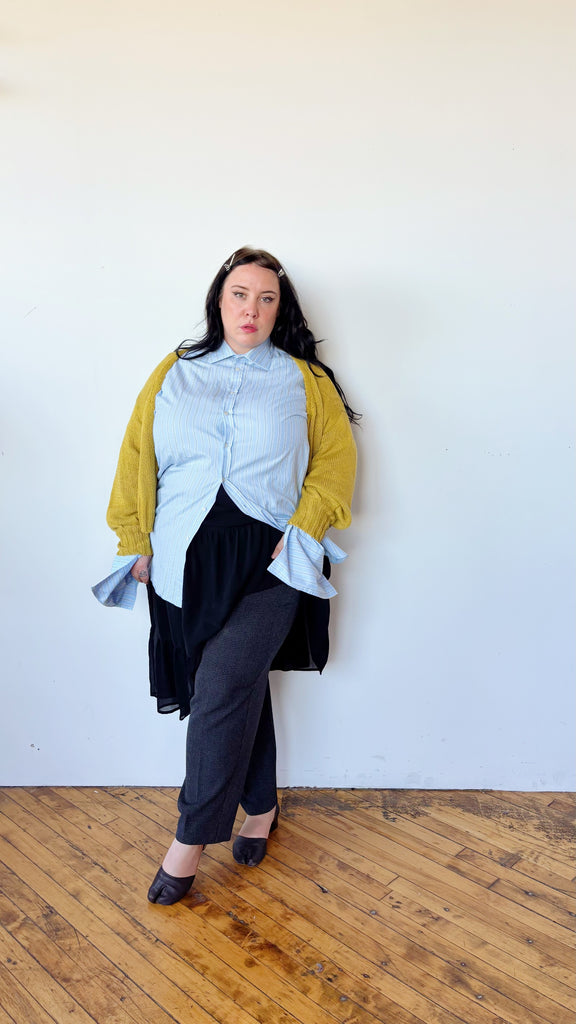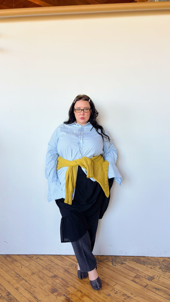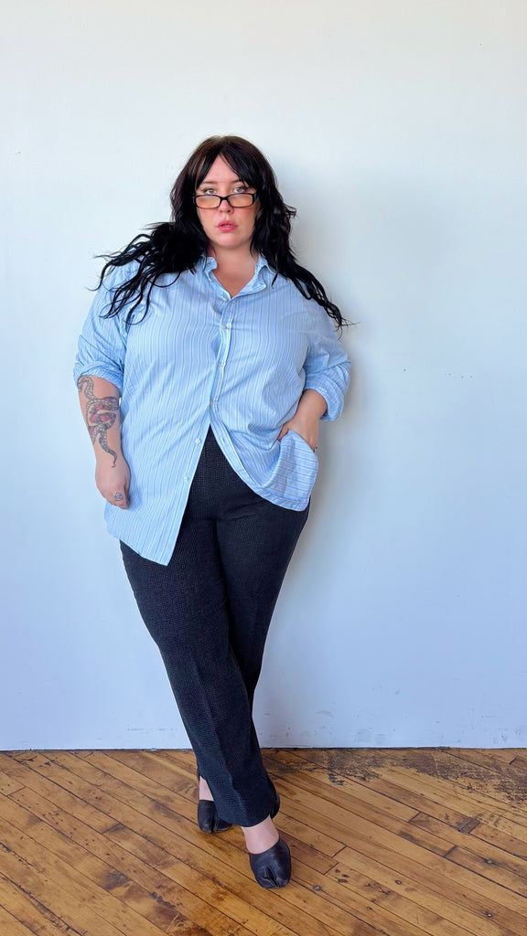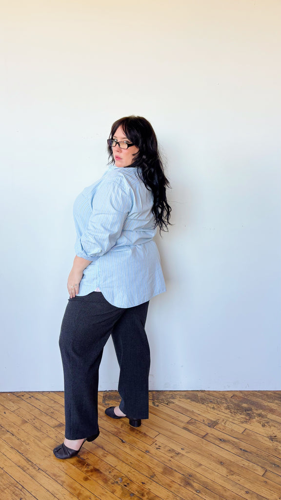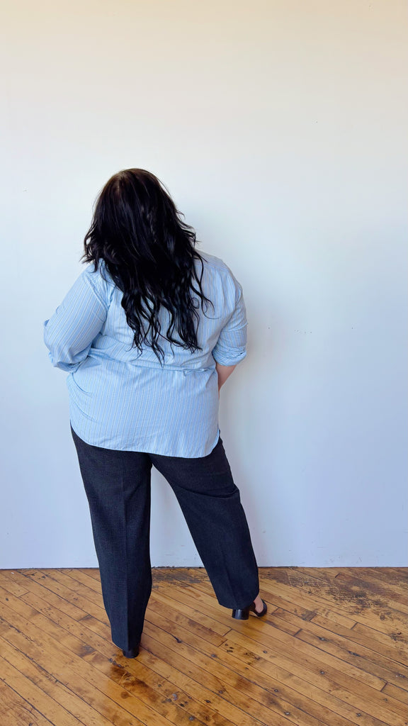Modern Thomas Pink blue striped button down. Large cuff sleeves that can be worn with cuff links or rolled. Button up front.