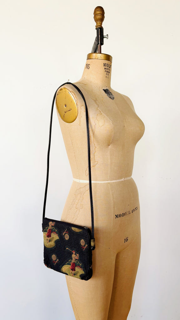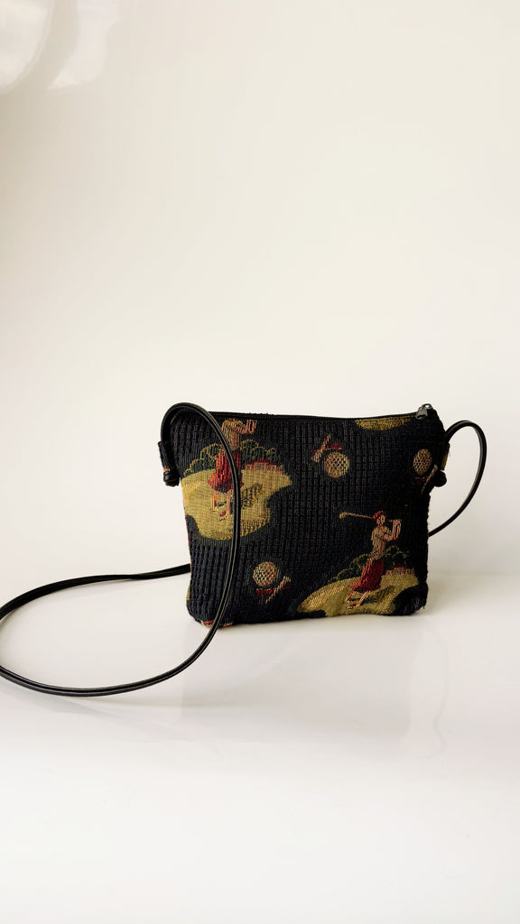 90's gold themed tapestry crossbody bag. Black cord strap. Zipper opening.