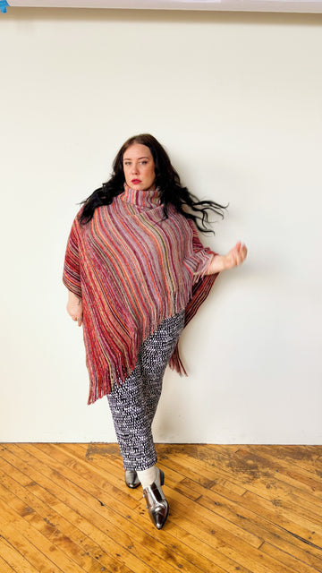 Y2K striped colorful poncho in purples and reds. Turtleneck. Fringe trim bottom.