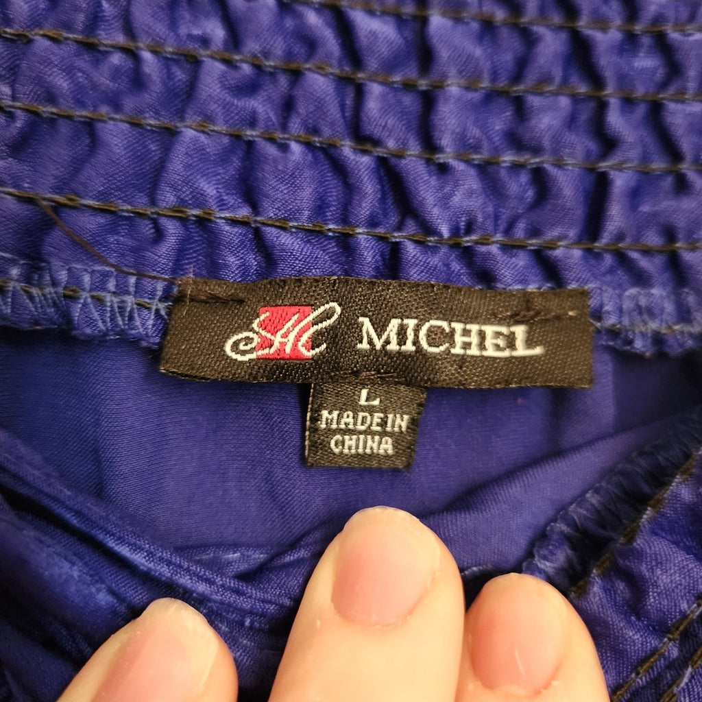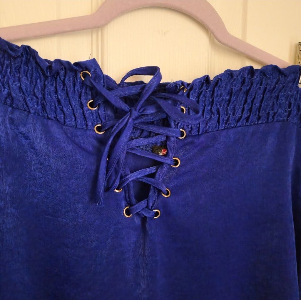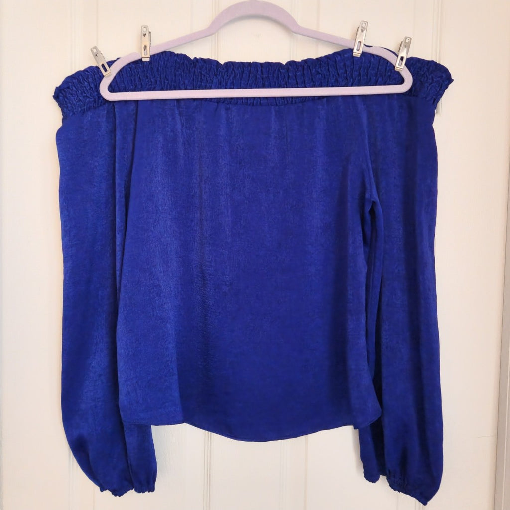 00's Michel royal blue off the shoulder long-sleeve top. Lace up at bust. Light poof to the sleeve. Silky feel to the fabric.