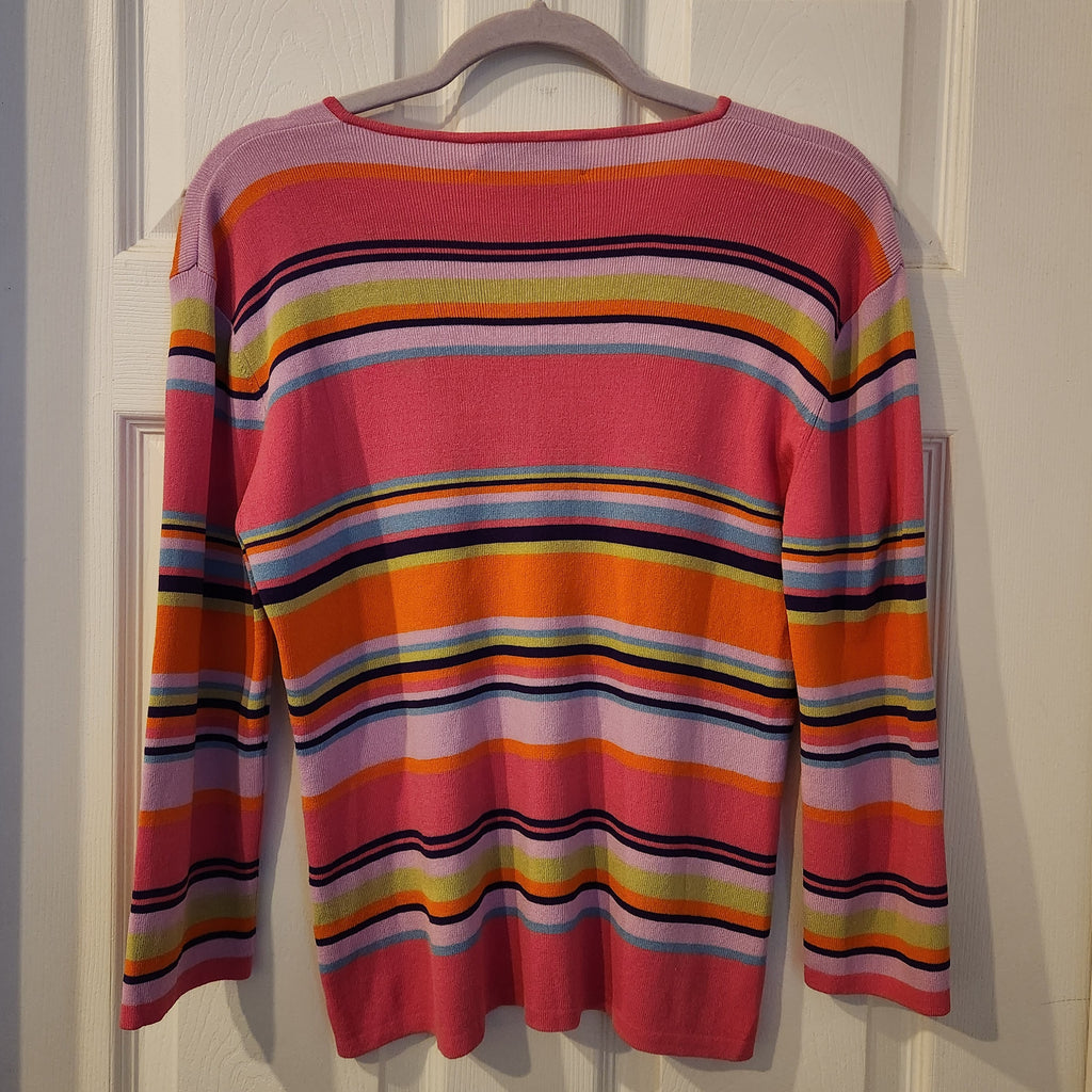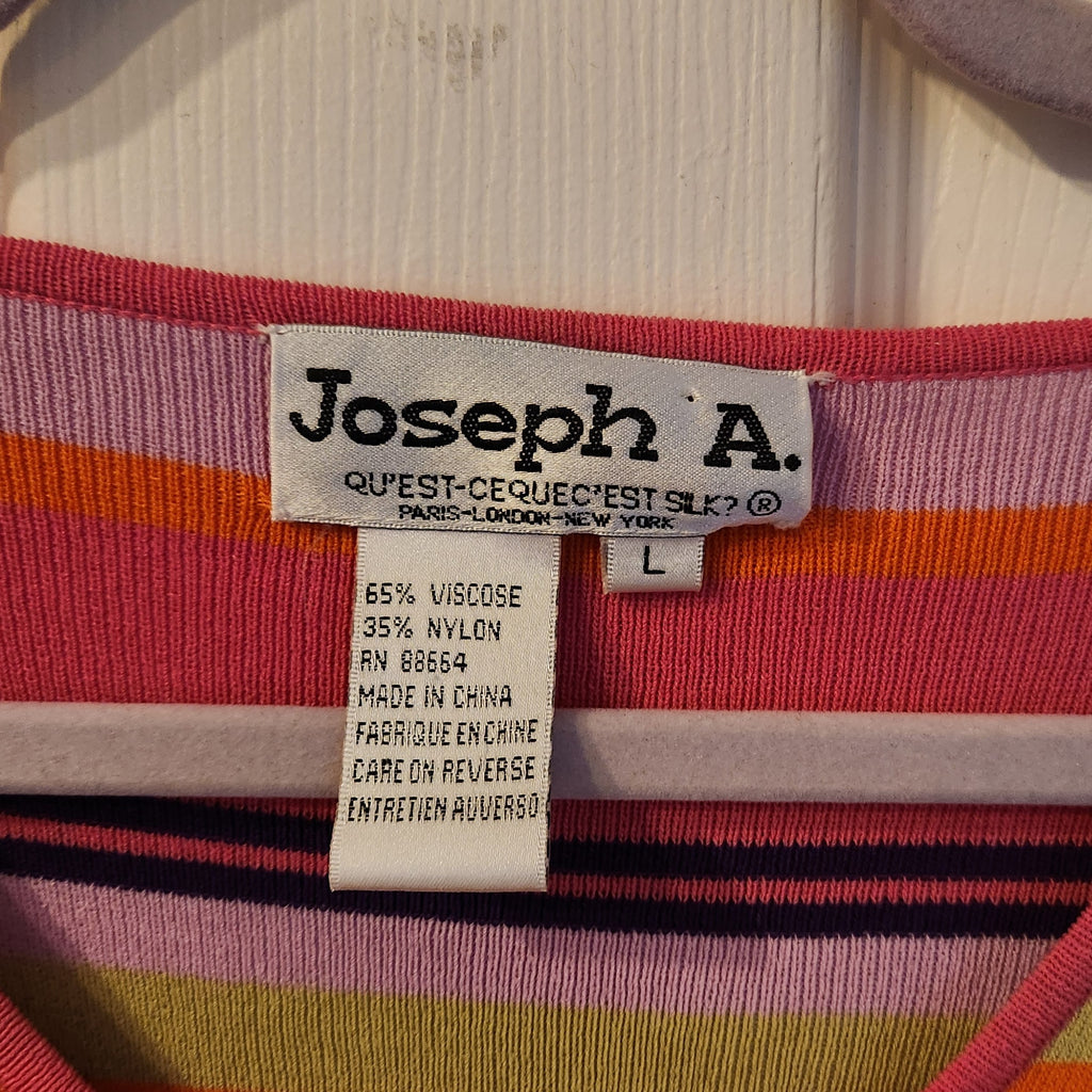 90's Joseph A. pink, purple, orange, green, and blue horizonal striped v-neck top. Quarter sleeve.