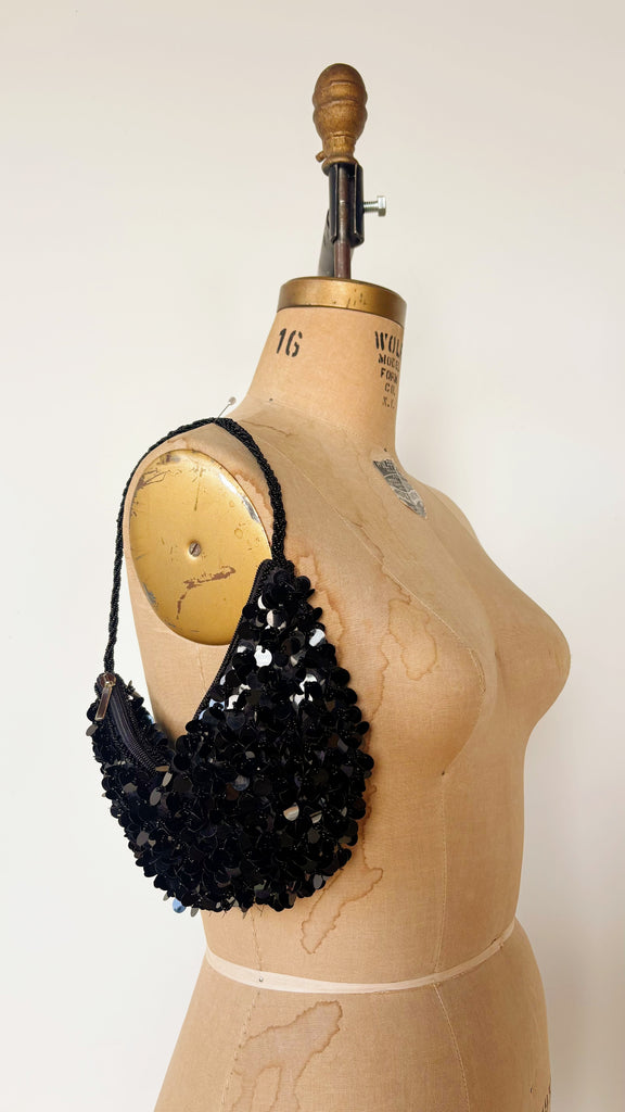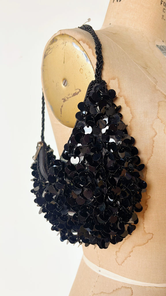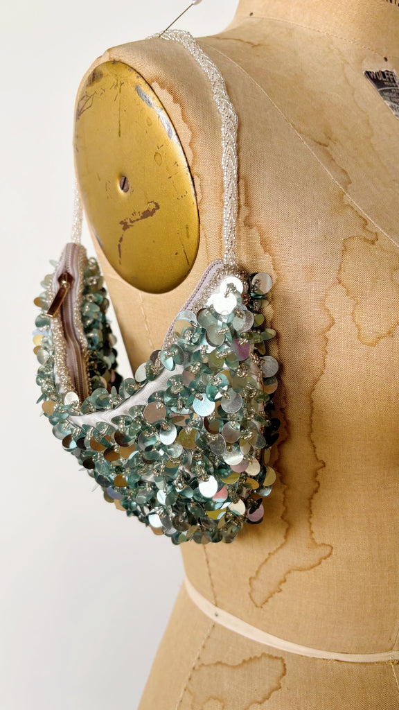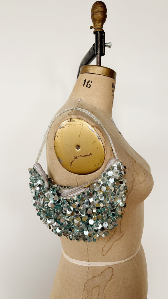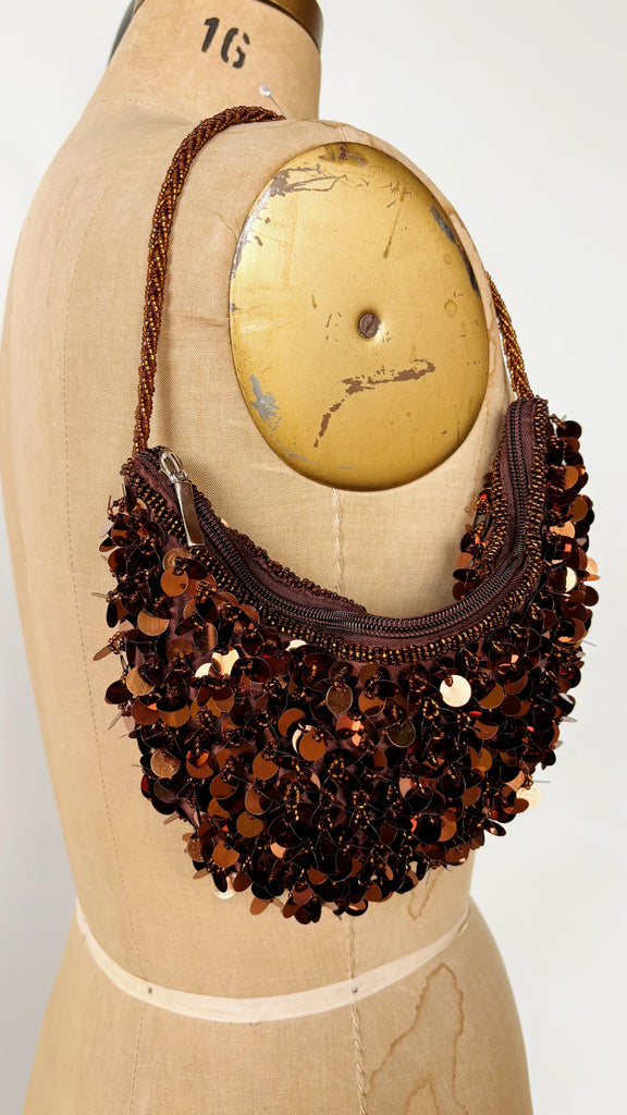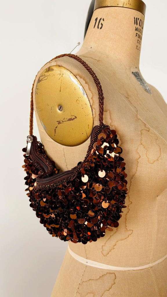 Your new favorite going out bag! Mini sequin hang bag in silver, black, brown and pink! Beaded strap. Zipper closure.