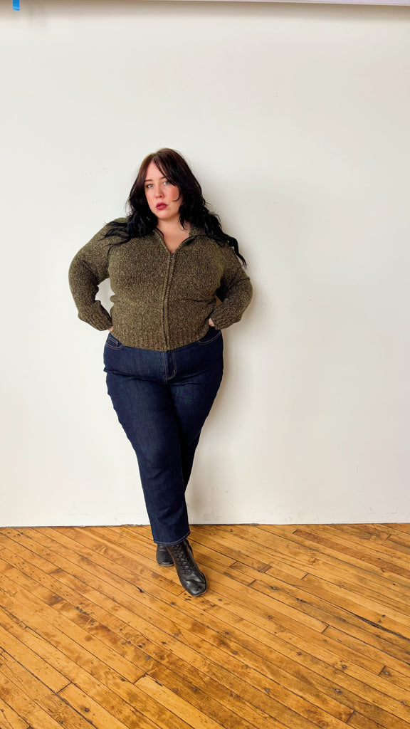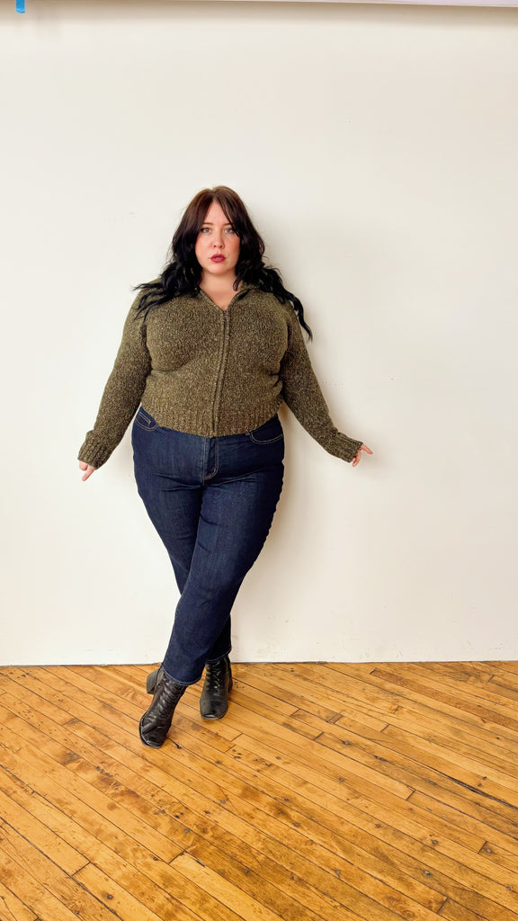 Y2K green knit zip up sweater. Fold over neckline. Long sleeves. Stretch knit.