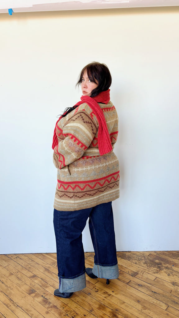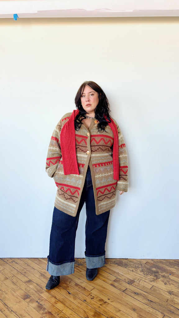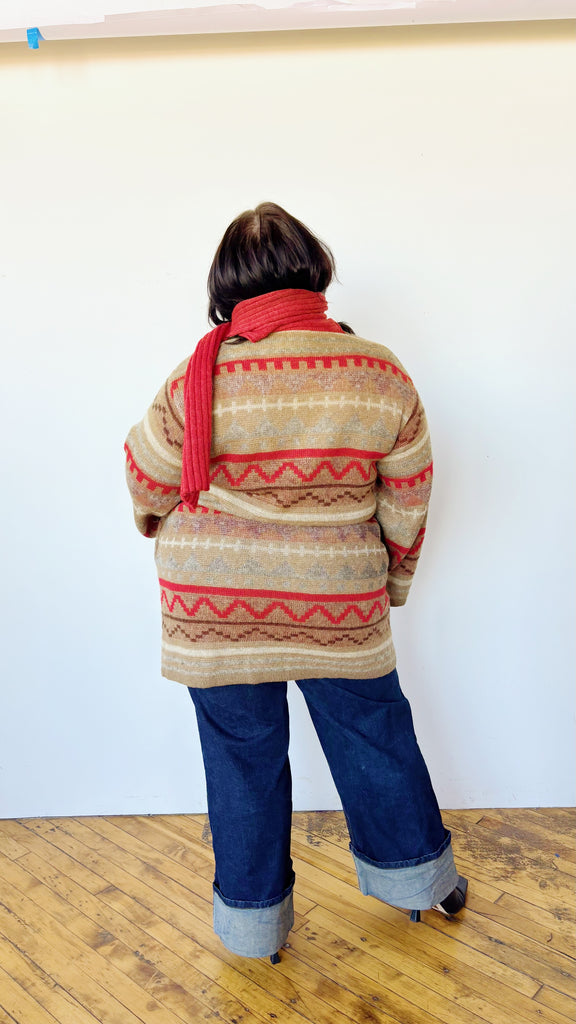 1980's Cervelle wool blend long cardigan with attached orange scarf. Three large button closures. Side pockets.