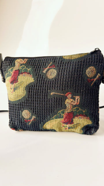 90's gold themed tapestry crossbody bag. Black cord strap. Zipper opening.