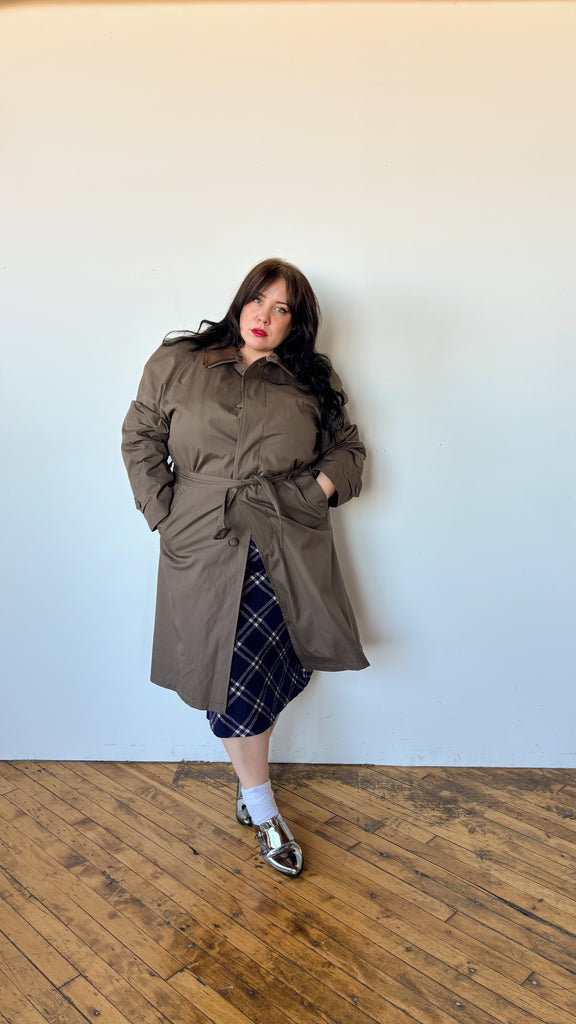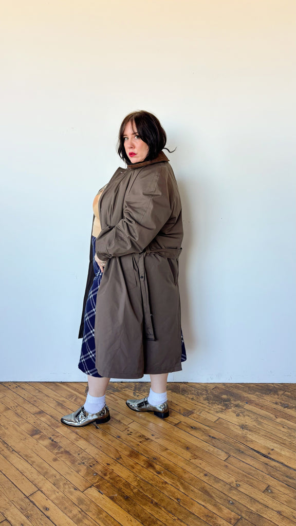 80's Jos. A Bank mocha trench coat. Zipped in thick lining. Removable suede collar. Button front. Waist tie. Side pockets.