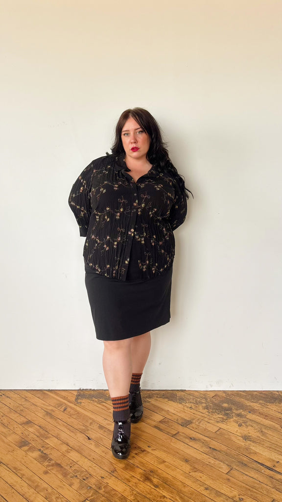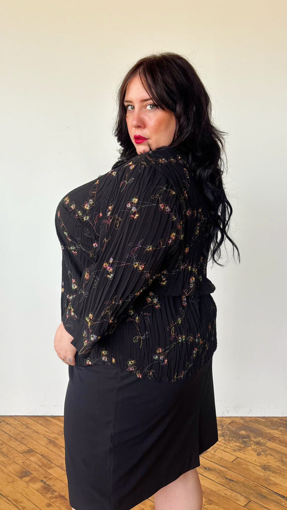 Y2K black pleated button down. Rainbow embroidered floral print. Collar neckline.