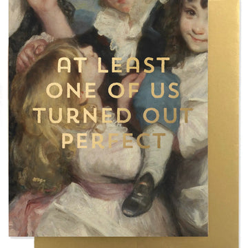 "ONE PERFECT" is stamped in gold foil over lush detail of an old master's painting (adorning the entire card front and back). Bring home life's luxuries out of fancy parlors and museums. Perfect for a cheeky yet resplendent Mother's Day.