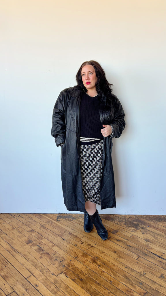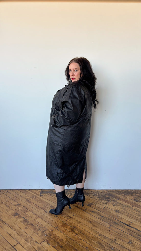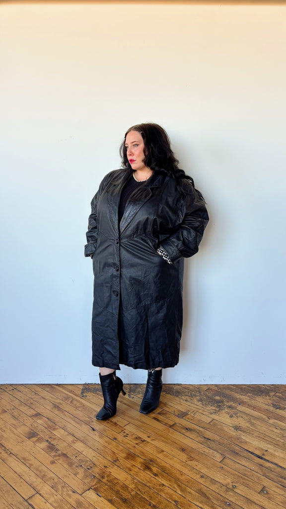 90's long line leather coat. Decorative buttons up the front. Collar neckline. Side pockets. Fully lined. Pleated large shoulders.