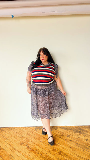 70's knit striped sweater vest. Grey, navy, red and white stripes. Scoop neckline. Stretchy knit.