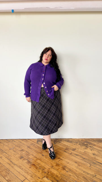 Vintage 90's purple knit cardigan. Collar neckline with buttons down the front. Long sleeves.