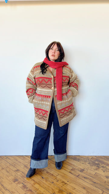 1980's Cervelle wool blend long cardigan with attached orange scarf. Three large button closures. Side pockets.