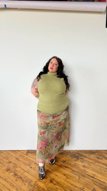Y2K sage green ribbed knit top by Rena Rowan. Sleeveless turtleneck.