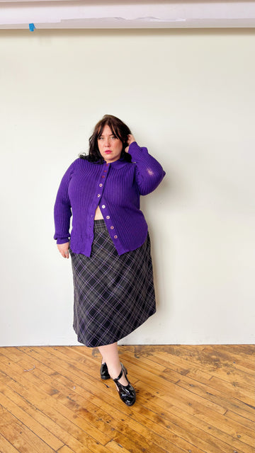 90's grey, black and purple plaid midi skirt. Side zipper.