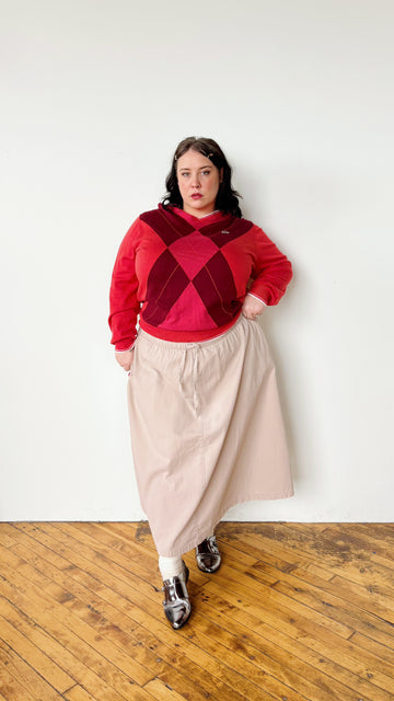 Red and pink argyle Lacoste sweater. White trim. Long sleeves. V neckline.