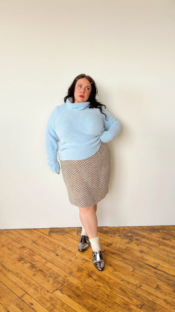 90's diamond print knee length skirt in cream and black. Fully lined. Back zipper and button closure.