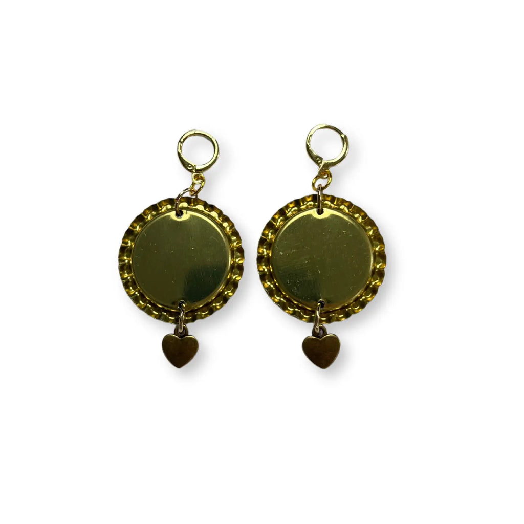 Delicately designed earrings made with our signature brass aluminum bottle caps and a vintage brass mini heart. Anchored on a lever-back, stainless steel, huggie hoop earring base.