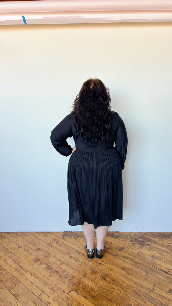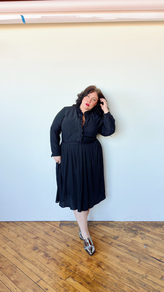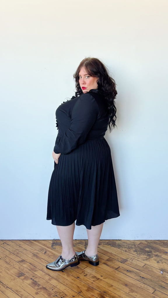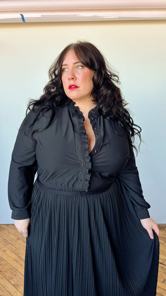 1970's Loral Original black dress. Small bronze button up front. Ruffled trim. Pleated skirt. Elastic waistband with matching black tie.