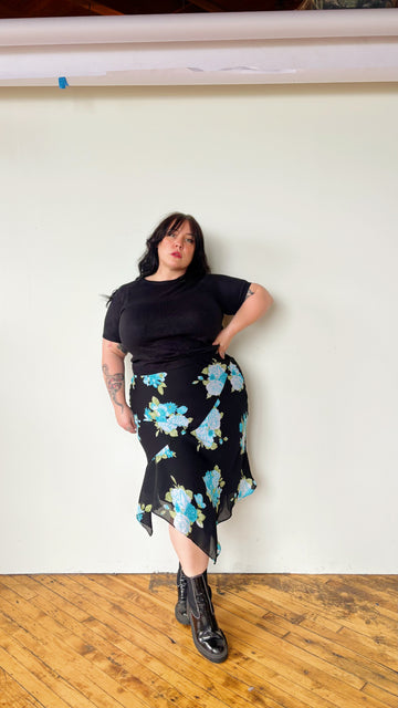 Y2K black and blue floral skirt. Asymmetrical handkerchief hemline. Fully lined. Elastic waistband.