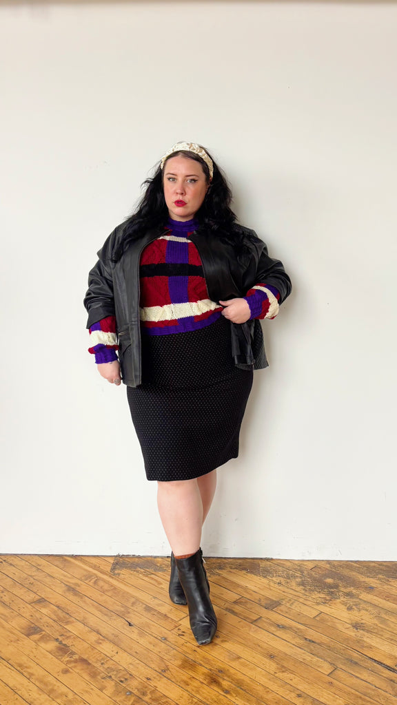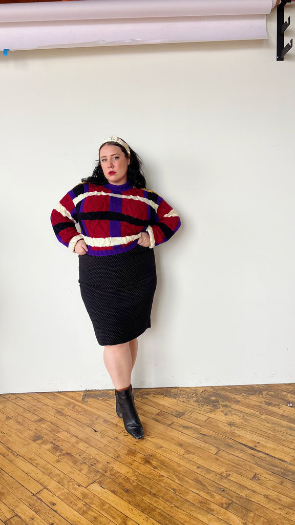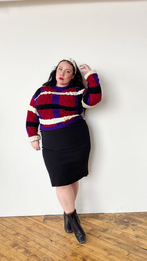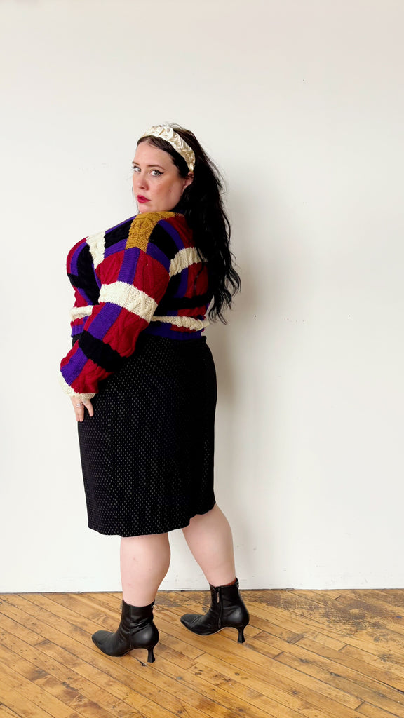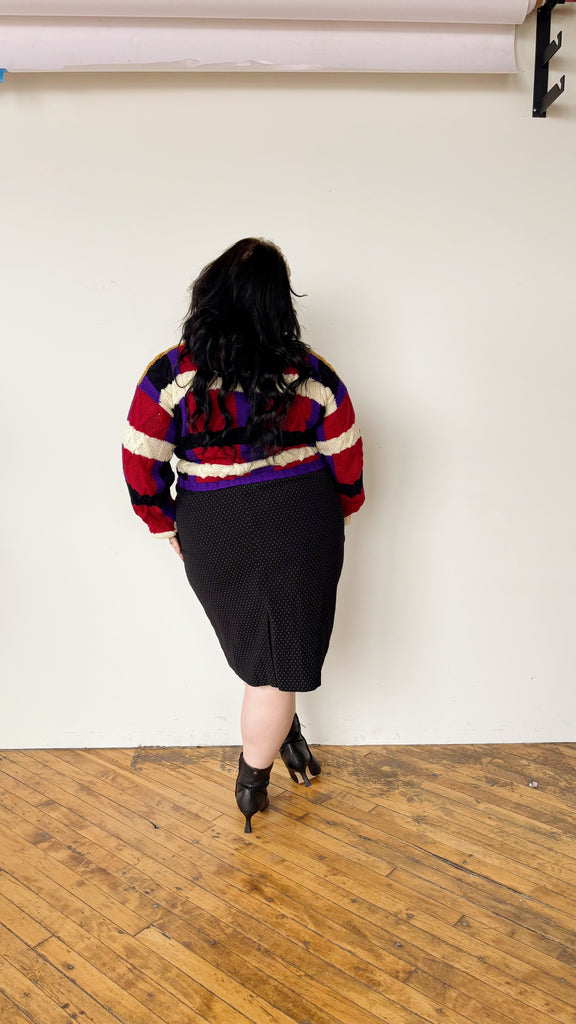 90's Le Suit black pencil skirt. White mini rectangle print. Fully lined. Back zipper with a hook and eye closure.